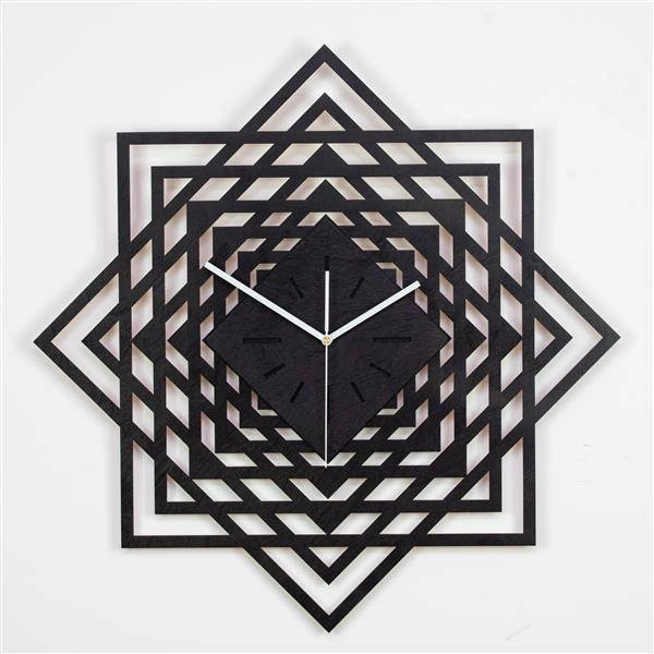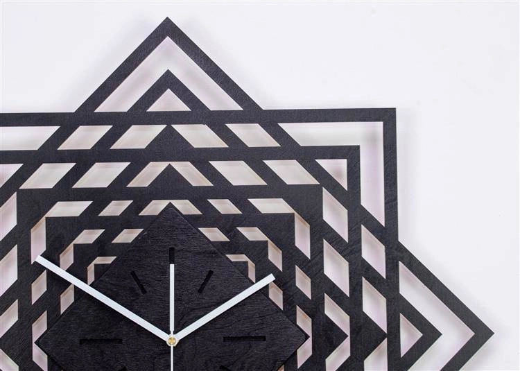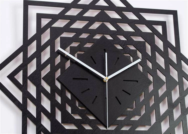 - Nowoczesny zegar ścienny ażurowy ŚWIĘTA GEOMETRIA w kolorze czarnym zachwyca wysokiej jakości wykonaniem połączonym z estetyką na najwyższym poziomie. Zastosowana w tym modelu podwójna sklejka tworzy oryginalny trójwymiarowy wzór.