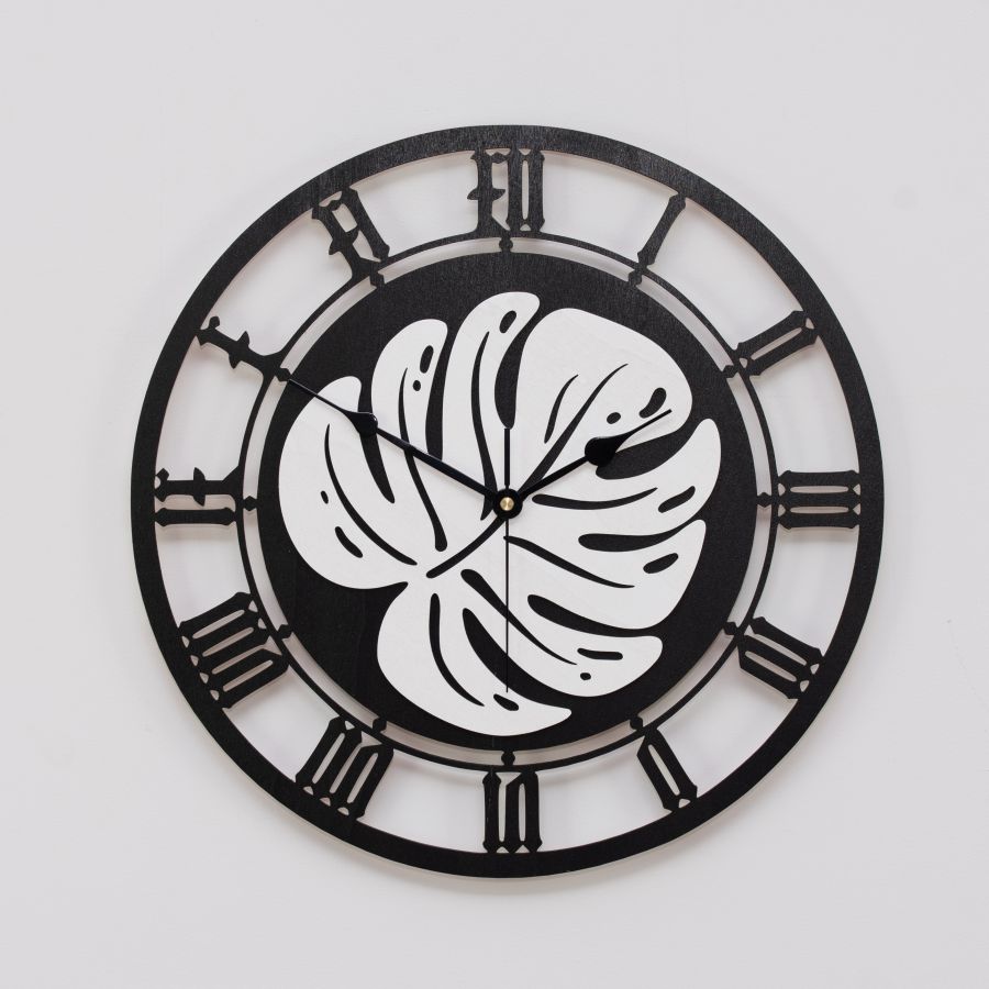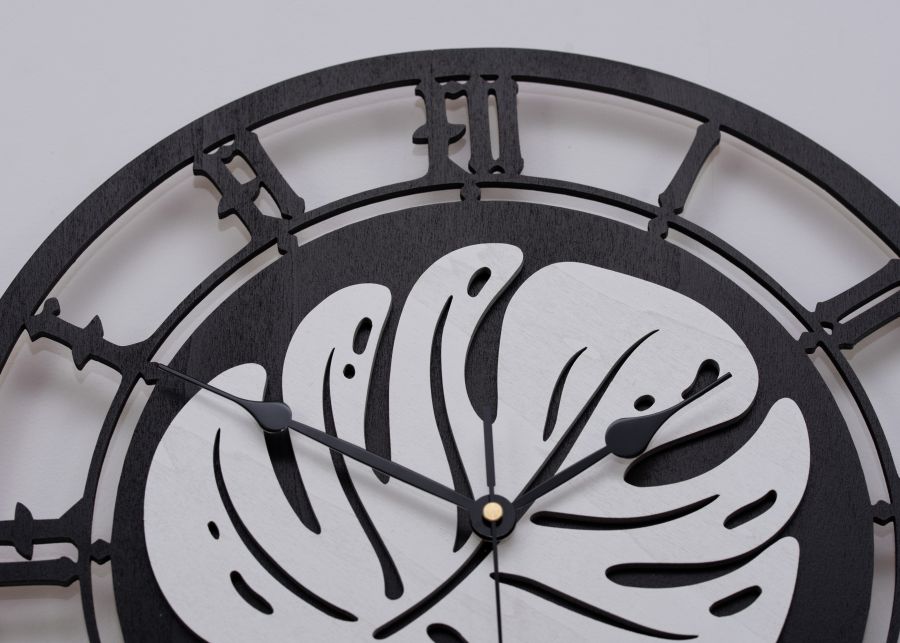 - Zegar ścienny MONSTERA w czarno-białej kolorystyce zachwyci wszystkich miłośników kwiatowych dekoracji. Ten model został wykonany ze sklejki 4 mm, dzięki czemu jest lekki, praktyczny i stylowy.
