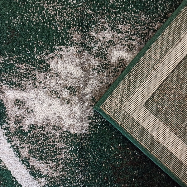• Nowoczesny dywan OTTO 07 w odcieniu szarości i butelkowej zieleni z minimalistycznym wzorem koła i ramy. Przędza heat set frise, runo 9 mm, certyfikat OEKO-TEX. Idealny do salonu, sypialni i biura.