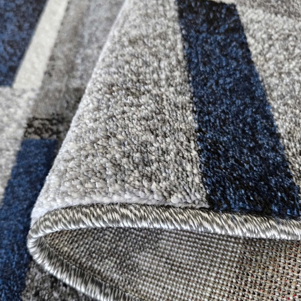 Dywan OTTO 09 szaro-niebieski to doskonały wybór dla miłośników nowoczesnego designu. Geometria prostokątów i bloków kolorystycznych tworzy efektowną, a zarazem uporządkowaną kompozycję. Zestawienie chłodnych szarości z głębokim granatowym akcentem sprawia, że dywan pasuje zarówno do jasnych, jak i ciemniejszych wnętrz. Ten model świetnie sprawdzi się w salonie, gabinecie, pokoju młodzieżowym lub nowoczesnym przedpokoju. Jego stonowana, ale niebanalna kolorystyka idealnie wpisuje się w aktualne trendy wnętrzarskie.Trwałość i jakość – dywan z przędzy heat set frise