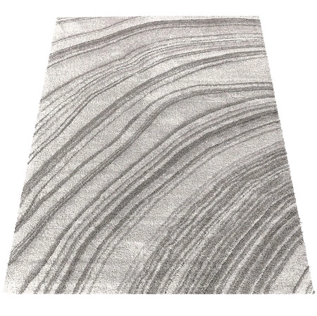 Dywan Serenity 02 w odcieniu szarości to elegancka propozycja do wnętrz, w których dominuje stonowana kolorystyka. Dekoracyjny wzór przypomina subtelne fale lub słoje drewna, co tworzy efekt przestrzenności i nadaje całości naturalnego charakteru. Kolory układają się w harmonijną kompozycję od jasnej szarości po głębsze grafitowe linie, co czyni dywan niezwykle uniwersalnym i łatwym do zestawienia z innymi elementami wystroju. To wzór, który dekoruje, ale nie przytłacza.Wysokie runo Shaggy i certyfikowana jakość