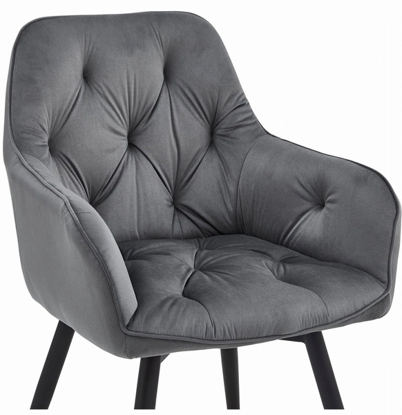 - Krzesło JORK360: welurowe siedzisko, kolor ciemnoszary, metalowe nogi w kolorze czarnym. Wysokość siedziska 49 cm — pasuje do jadalni, kuchni i przestrzeni dziennej Spójne wymiary i materiały ułatwiają dopasowanie do stołu oraz podłogi.