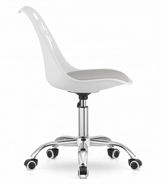 Krzesło PRINT: siedzisko z polipropylenu, kolor biały, chromowana podstawa na kółkach, funkcja obrotowa. Wysokość siedziska 41–52,5 cm (regulowana) — sprawdza się przy biurku w domu, w gabinecie i w strefie beauty
