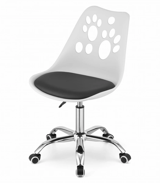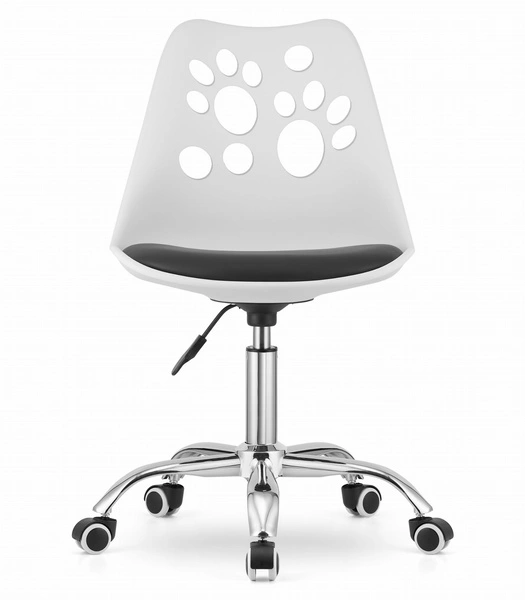 - Krzesło PRINT: siedzisko z polipropylenu, kolor biały, chromowana podstawa na kółkach, funkcja obrotowa. Wysokość siedziska 41–52,5 cm (regulowana) — sprawdza się przy biurku w domu, w gabinecie i w strefie beauty