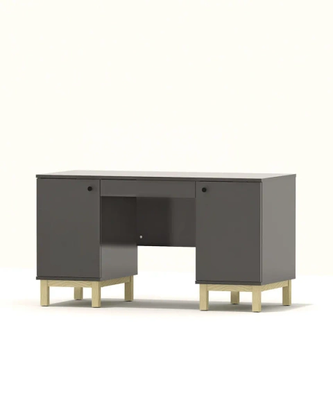 Zestawienie dwóch bocznych szafek o szerokości 39 cm z szeroką szufladą pod blatem sprawia, że biurko B-MODEL-2 oferuje naprawdę dużo miejsca na przechowywanie. W jednej szafce możesz trzymać segregatory, dokumenty i zeszyty, w drugiej ulubione książki, pudełka z akcesoriami czy sprzęt biurowy, a w szufladzie podblatowej schować klawiaturę, notatnik i drobne przedmioty, które chcesz mieć zawsze pod ręką. W konfiguratorze wybierzesz szerokość biurka, głębokość dostosowaną do Twojej przestrzeni oraz kolor korpusu i frontów. B-MODEL-2 sprawdzi się jako biurko do pracy w domu, stanowisko dla nastolatka uczącego się z laptopem lub strefa home office w salonie, gdzie liczy się zarówno porządek, jak i spokojna, skandynawska linia mebla. W każdej chwili możesz też rozbudować zestaw, dokupując dostawkę D-MODEL-1 z dodatkowymi szufladami lub szafką.