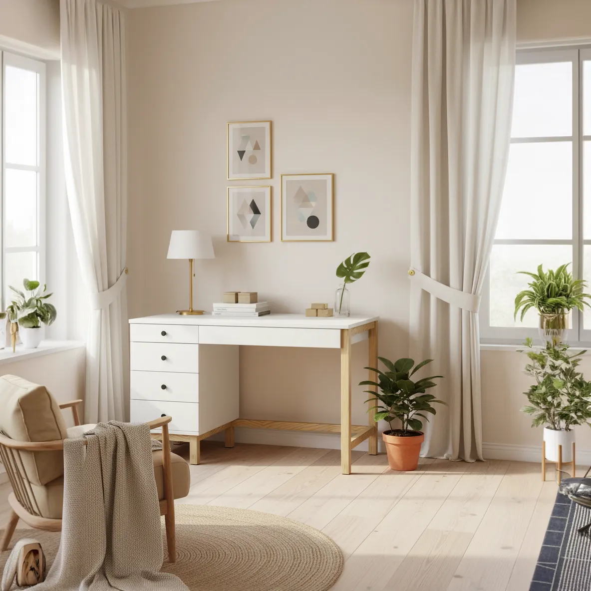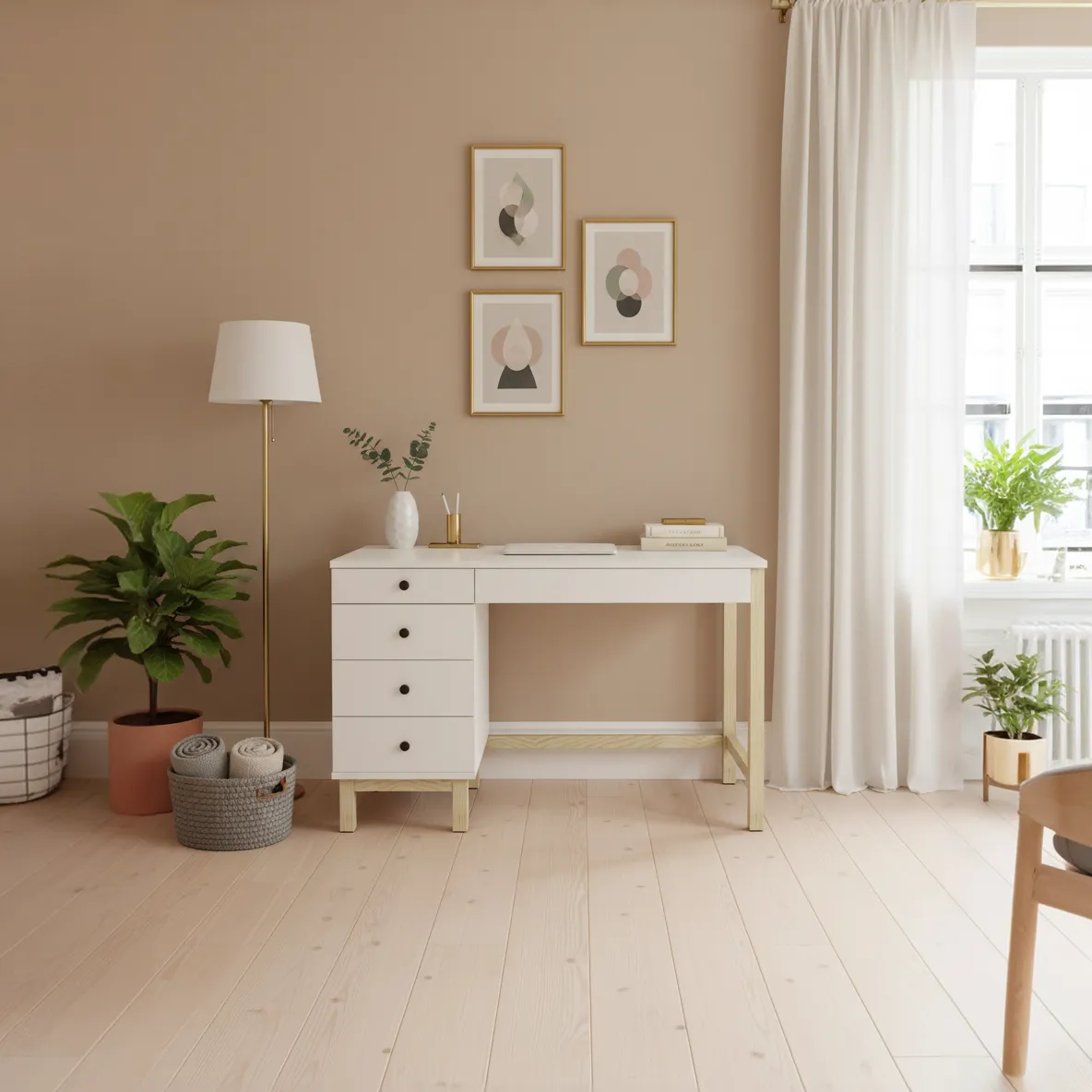 Połączenie laminowanego blatu 18 mm i naturalnego stelaża z litego drewna nadaje biurku wizualną lekkość, która pasuje do jasnych wnętrz scandi, pokojów młodzieżowych i małych domowych gabinetów. Niezależnie od tego, czy używasz go do pracy zdalnej, nauki czy kreatywnych projektów, biurko B-MODEL-3 staje się miejscem, do którego wracasz z przyjemnością: daje poczucie porządku, równowagi i codziennego komfortu — takiego, który naprawdę zmienia jakość dnia.