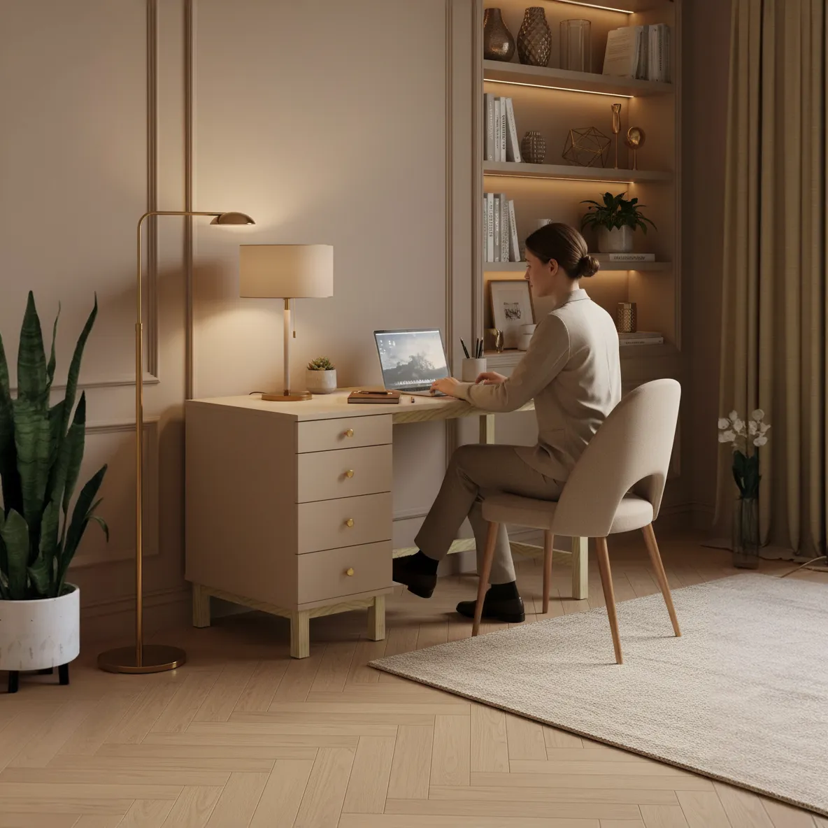 Cztery boczne szuflady w kontenerze 39 cm pomagają uporządkować dokumenty, zeszyty i akcesoria, a duży blat tworzy wygodną przestrzeń do pracy z laptopem i monitorem. W konfiguratorze wybierzesz stronę kontenera — lewą lub prawą — tak, aby biurko B-MODEL-4 pasowało do układu pokoju, gniazdek i światła dziennego. Model sprawdzi się w domowym gabinecie, strefie home office, pokoju nastolatka, a także w bardziej reprezentacyjnych przestrzeniach, gdzie liczy się zarówno funkcjonalność, jak i uporządkowany, spójny wizualnie front z szufladami.