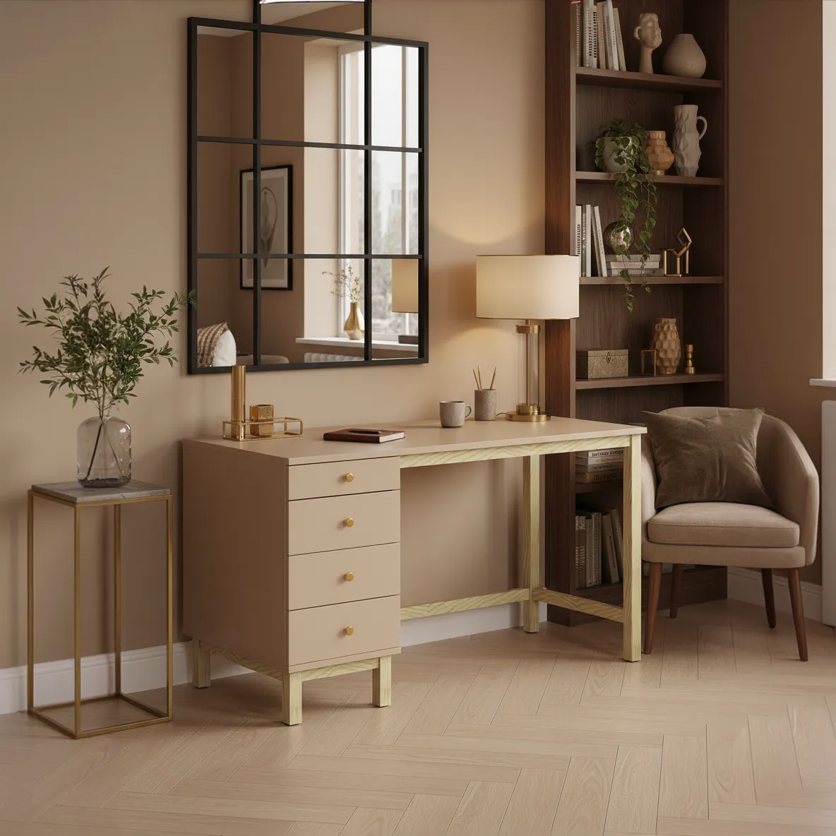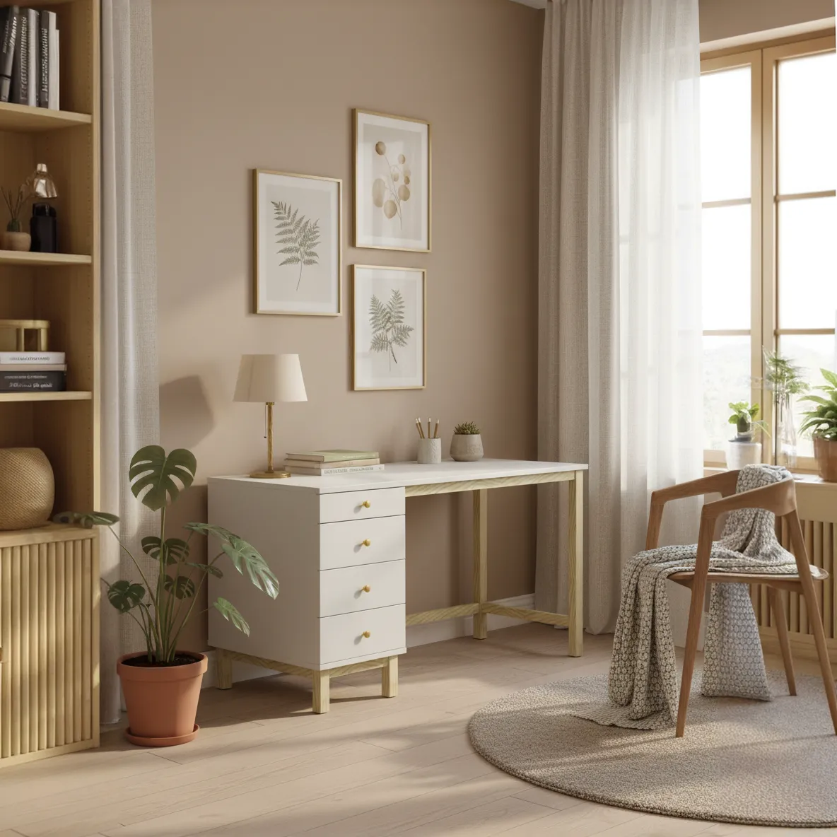 VERYSIMPL B-MODEL-4 zostało zaprojektowane z myślą o osobach, które lubią mieć wszystko pod ręką, ale na blacie cenią porządek. Cztery boczne szuflady pomieszczą długopisy, drobne akcesoria i większe formaty, takie jak zeszyty, segregatory czy dokumenty A4. Duży blat zapewnia wygodę przy pracy z komputerem, projektach kreatywnych i nauce, a plecy z płyty 18 mm montowane „na klik” wzmacniają konstrukcję i pozwalają ustawić biurko także bliżej środka pokoju. Mebel łączy w sobie płytę laminowaną 18 mm ze stelażem z litego drewna sosnowego, co daje przyjemne połączenie nowoczesnej powierzchni i naturalnego ciepła drewna. Możesz wybrać szerokość od 100 do 140 cm oraz głębokość 50, 60 lub 70 cm, dopasowując biurko do małego kącika pracy albo pełnowymiarowego gabinetu. W konfiguratorze zdecydujesz o stronie kontenera, kolorze korpusu i blatu oraz rodzaju uchwytów, dzięki czemu B-MODEL-4 sprawdzi się zarówno w jasnym wnętrzu scandi, jak i w bardziej zdecydowanej, grafitowej aranżacji w stylu loft. To polska produkcja, w której funkcjonalność idzie w parze z prostą, ponadczasową linią.