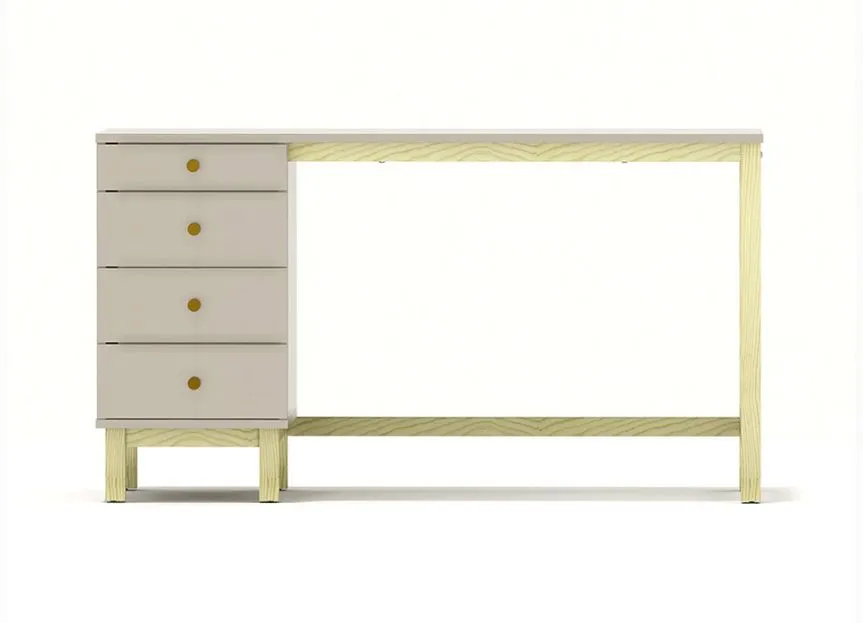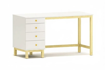 B-MODEL-4 to klasyczne biurko z czterema bocznymi szufladami w kontenerze 39 cm. Oferuje dużą powierzchnię blatu do pracy i nauki, plecy z płyty 18 mm montowane „na klik” oraz stabilny stelaż z litego drewna sosnowego.