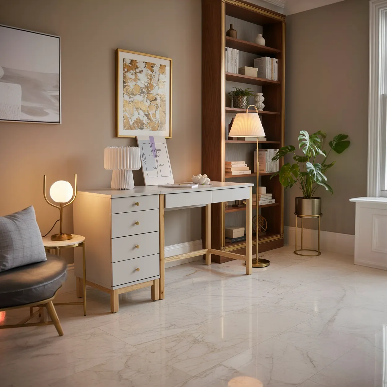 Wyobraź sobie poranek, w którym pierwsze spojrzenie pada na uporządkowany blat, miękkie światło i jasną przestrzeń gotową na wszystko, co dziś zaplanowałeś. Zestaw B+D-MODEL-5 tworzy właśnie taką bazę — spokojne miejsce, w którym dokumenty, zeszyty i drobiazgi mają swoje stałe szuflady, a na powierzchni zostaje tylko to, nad czym chcesz się skupić. Dwie płytkie szuflady podblatowe dyskretnie chowają klawiaturę, notes czy ulubione pióro, a dostawka z kontenerem przejmuje rolę domowego archiwum. W zależności od wybranej konfiguracji możesz mieć obok zamykaną szafkę, połączenie szuflady z szafką albo aż cztery szuflady na wszystko, co wymaga systematycznego porządku.