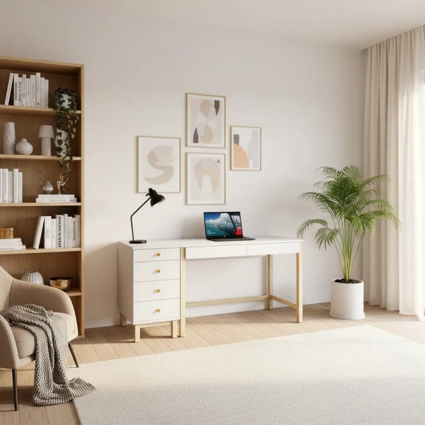 Zestaw B+D-MODEL-5, białe biurko i dostawka w przytulnym wnętrzu scandi