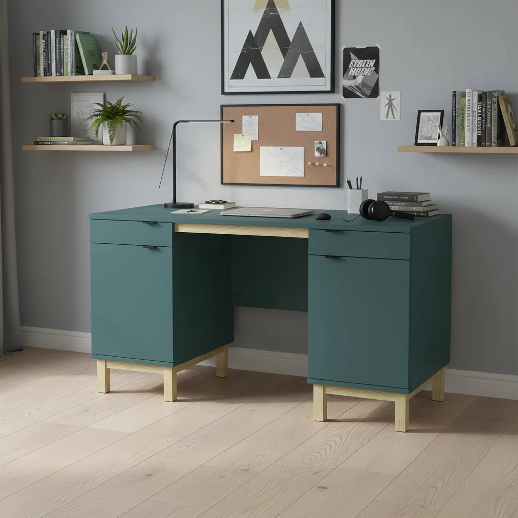 Biurko VERYSIMPL B-MODEL-1 możesz zamówić jako białe biurko, beżowe biurko, grafitowe biurko, a także w odcieniach zieleni i niebieskiego, takich jak ciemnopetrolowy (Petrol NCS S 6020-B30G) czy zgaszona zieleń Smoke Green (K521). W palecie TRENDY znajdziesz m.in. jasnoszary Cashmere 5981, pudrowy róż Native Pink (K512), ceglany Deep Sahara (K514), jasny błękit Surf Blue (K518) oraz granatowo-niebieski Alby Blue 5994. Dla miłośników drewna przygotowaliśmy dekory: dąb piaskowy (K543 Sand Barbera Oak), dąb kamienny (5527 Stone Oak), dąb orzechowy (K544 Hazel Silverjack Oak) i dąb czekoladowy (K554 Chocolate Hudson Oak). Dzięki temu to samo biurko może wyglądać jak lekki mebel scandi, klasyczny gabinetowy mebel w dębie lub odważny akcent kolorystyczny w pokoju nastolatka.