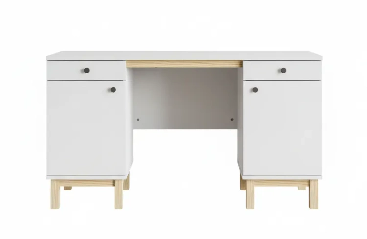 Blat oraz korpus biurka wykonane są z płyty laminowanej 18 mm (Kronospan), która dobrze znosi codzienne użytkowanie, jest odporna na drobne zarysowania i łatwa do utrzymania w czystości. Stelaż z litego drewna sosnowego zapewnia stabilne oparcie nawet przy szerokości 160 cm, a jednocześnie wprowadza do wnętrza naturalne ciepło. Boczne szafki skrywają płytkie szuflady na przybory piśmiennicze oraz zamykane części z półkami, idealne na dokumenty, segregatory czy pudełka z akcesoriami. W szufladach zastosowano prowadnice dolnego montażu z pełnym wysuwem i cichym domykiem, dzięki czemu fronty pracują płynnie i bez stukania. Plecy z płyty 18 mm montowane „na klik” usztywniają bryłę biurka i przyspieszają montaż, zachowując estetyczny wygląd także od strony tylnej.