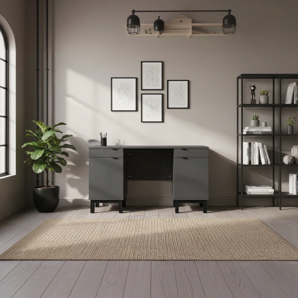 Proporcje biurka zostały dobrane tak, aby przy szerokości 140–160 cm zyskać wygodny blat do pracy z laptopem, monitorem i notatkami, a jednocześnie nie przytłoczyć pomieszczenia. Do wyboru masz trzy głębokości: 50, 60 lub 70 cm, dzięki czemu łatwo dopasujesz mebel zarówno do małego kącika home office w salonie, jak i większego gabinetu. Zamykane szafki po obu stronach porządkują przestrzeń — w środku schowasz rzeczy, których nie chcesz eksponować, natomiast na blacie zostanie miejsce tylko na to, co naprawdę potrzebne. Biurko VERYSIMPL B-MODEL-1 odnajdzie się w jasnym wnętrzu scandi, przytulnym pokoju młodzieżowym, a w ciemniejszych kolorach także w nowoczesnym biurze z nutą loftu. Konfigurator zamówienia pozwoli dopracować detale: szerokość, głębokość, kolor frontów i rodzaj uchwytów, aby całość harmonijnie wpisała się w istniejącą aranżację.