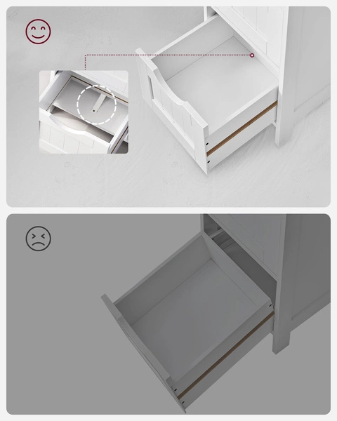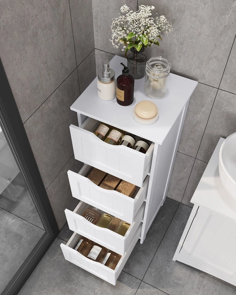 ☑️ Szukasz praktycznego i stylowego mebla, który pomoże Ci uporządkować przestrzeń w łazience? Ta biała szafka łazienkowa z czterema pojemnymi szufladami to idealne rozwiązanie do małych i dużych łazienek.