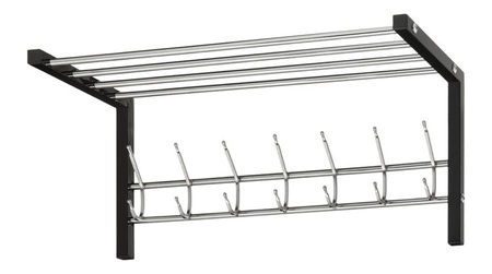 Wieszak ścienny w nowoczesnej formie. Forma wieszaka to czysta prostota gdyż składa się na nią stelaż z prostokątnego profilu oraz chromowane rurki. Poziomo umieszczone haczyki, wszystkie na jednej wysokości. Pojemna półka na czapki, szaliki i kapelusze. W tylnej części wieszaka umiejscowione otwory na haczyki - kołki rozporowe dzięki którym wieszak zawiśnie na ścianie. O tym produkcie można napisać wiele. Solidna konstrukcja. Nowoczesna i minimalistyczna forma. Dopasowana do wnętrz kolorystyka. Niezbędny w każdym mieszkaniu oraz domu. Z łatwością przechowasz na nim kurtki, płaszczyki, torebki, plecaczki, klucze solo lub na tzw. smyczy. Wieszaki ścienne są idealnym rozwiązaniem do mniejszych powierzchni. Spełniają swoją funkcję w pełni ale nie zajmują tyle miejsca co wieszak stojący. Idealnie będzie się komponował z klasycznym siedziskiem w przedpokoju. Przeznaczony do nowoczesnych wnętrz, klasycznie urządzonych korytarzy, przytulnych przedsionków oraz przedpokoi. Wygląd wieszaka na ubrania przyciąga wzrok. Był to cel projektantów tego mebla.