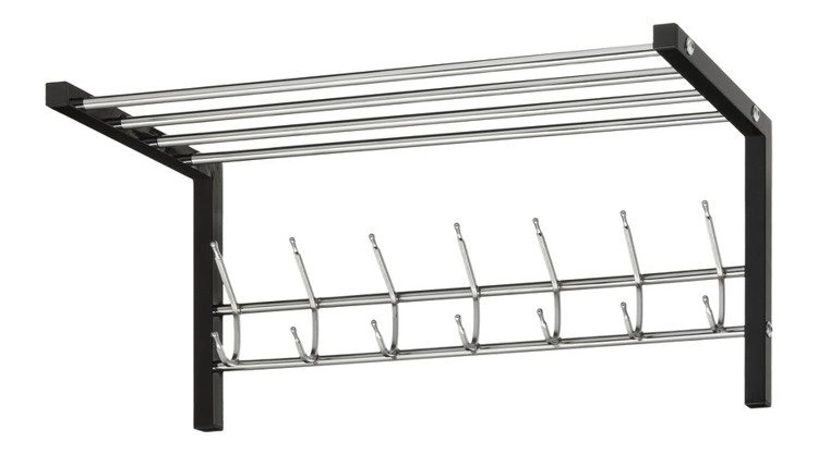• Nowoczesny, prosty w formie, elegancki wieszak ścienny na ubrania z półką na nakrycia głowy. Wykonany z trwałego metalu z gwarancją wieloletniego użytkowania. Posiada 7 uchwytów na odzież i półkę. Idealny w nowoczesnych, industrialnych wnętrzach.