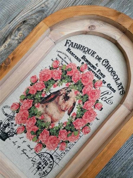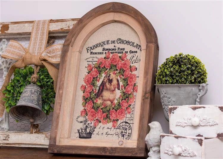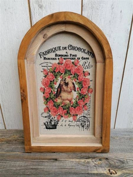 Rustykalna dekoracja ścienna z motywem królika. W środku drewnianej ramy w kształcie łuku umieściliśmy obraz w stylu vintage drukowany na tkaninie lnianej. Rozmiar dekoracji 37 x 56 cm. Dekoracja posiada zamontowany metalowy wieszak.