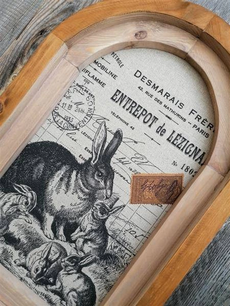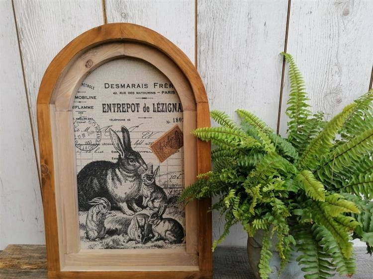 Rustykalna dekoracja ścienna z motywem królików. W środku drewnianej ramy w kształcie łuku umieściliśmy obraz w stylu vintage drukowany na tkaninie lnianej. Rozmiar dekoracji 37 x 56 cm. Dekoracja posiada zamontowany metalowy wieszak.