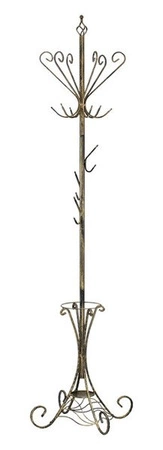 W górnej obrotowej i środkowej części posiada 12 uchwytów na kurtki i płaszcze a na dole miejsce na parasole z pojemnikiem na ociekającą wodę. Dodatkowo posiada specjalne haczyki na torebki. Malowany elektrostatycznie na czarno i ręcznie patynowany na kolor starego złota, dostępny jest również w innych wersjach kolorystycznych. Wieszak na ubrania o wysokości 210 cm sprawdzi się we wszystkich pomieszczeniach użytkowych. Stojący wieszak jest dodatkiem wielofunkcyjnym - oprócz tego, że może służyć jako wieszak na kurtki i płaszcze, posiada również miejsce na parasole z małym zbiorniczkiem na ociekającą wodę. Idealnie pasuje do wnętrz urządzonych w klasycznym stylu oraz nowoczesnym.