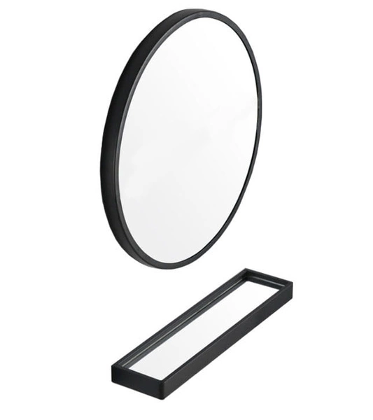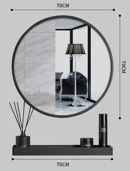 Okrągłe czarne lustro 70cm z praktyczną i ozdobną półką