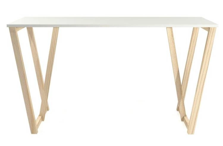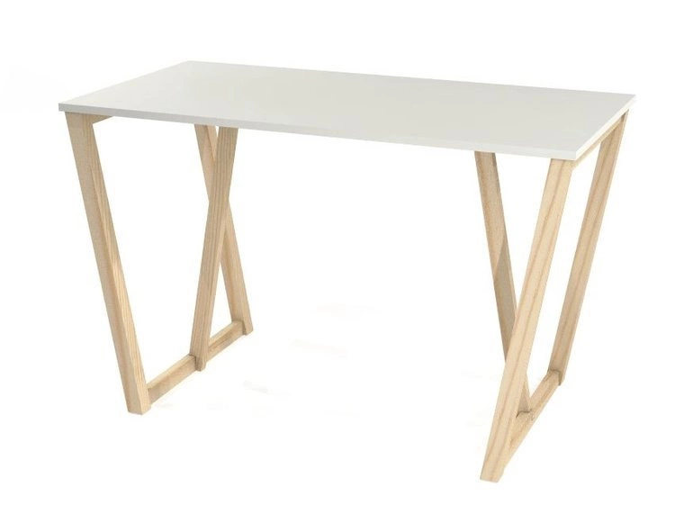 Stelaż wykonany z litego drewna sosnowego lakierowanego bezbarwnie, blat z białej płyty laminowanej.