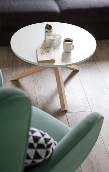 - Skandynawski w stylu stolik kawowy z okrągłym blatem na oryginalnym, trójnożnym stelażu. Bardzo dekoracyjny, zwracający uwagę. Stabilny i uniwersalny. Odpowiedni zarówno do mieszkań jak i lokali komercyjnych.