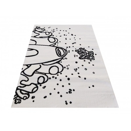 Dywan dziecięcy Soho 12 to fantastyczna propozycja dla małych odkrywców, którzy marzą o podróżach międzygwiezdnych. Utrzymany w minimalistycznej biało-czarnej kolorystyce, przedstawia zabawną rakietę, planetę i gwiazdy, tworząc spójną i rozwijającą wyobraźnię grafikę. Prostota wzoru idzie w parze z jego sugestywnością – dzieci od razu wiedzą, że to dywan z kosmosem. Taki motyw wprowadza do pokoju nie tylko element zabawy, ale także edukacyjny klimat, sprzyjający ciekawości i kreatywności.Miękka struktura i przędza BCF – komfort i trwałość na co dzień