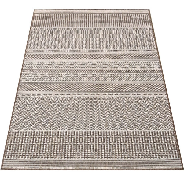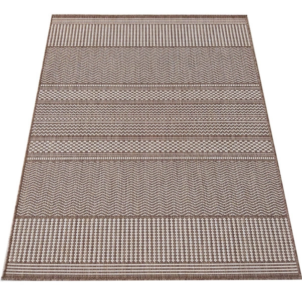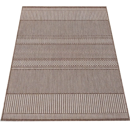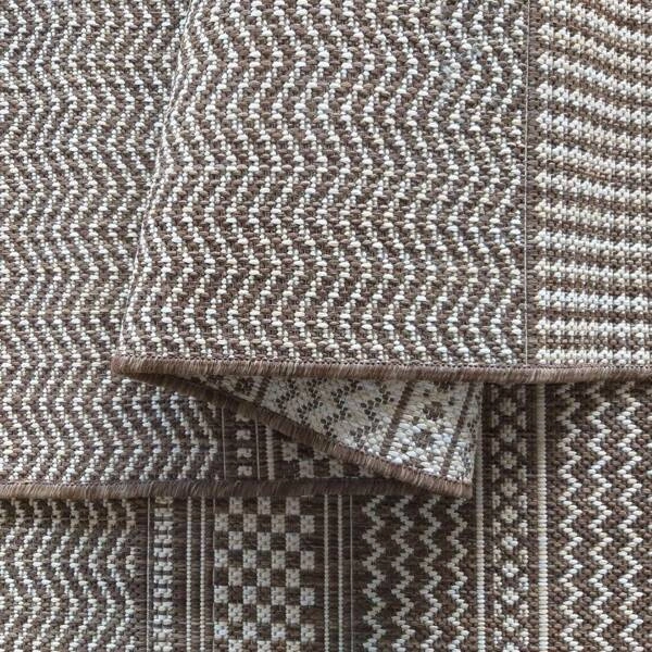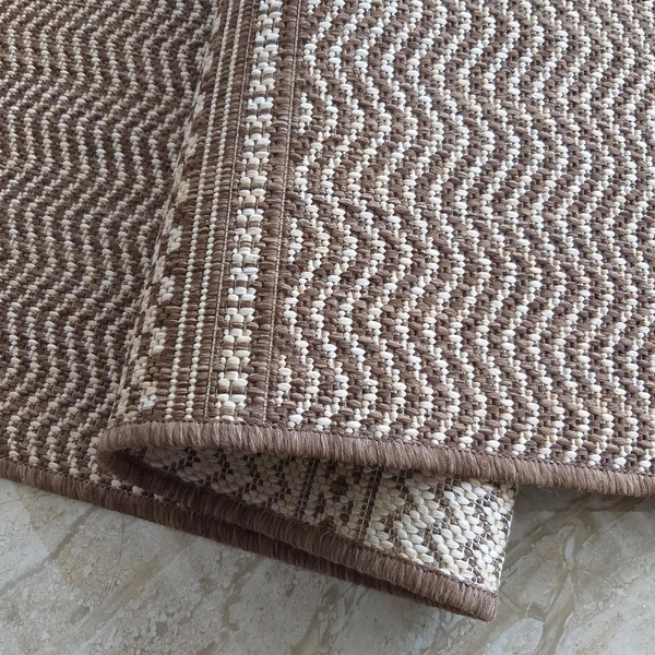 Dywan Zara 12 brązowy to nowoczesna propozycja, która idealnie wpisuje się w aktualne trendy aranżacyjne. Jego wzór oparty jest na geometrycznych pasach i zygzakach, które tworzą harmonijną kompozycję w odcieniach brązu i beżu. Tkanina ma delikatny połysk i wyraźną strukturę splotu sznurkowego, co nadaje całości lekkości i elegancji. Dywan prezentuje się stylowo zarówno w przestrzeniach wewnętrznych, jak i zewnętrznych, dodając im przytulnego, ale zarazem designerskiego charakteru. Jego dwustronna forma pozwala na łatwą zmianę wyglądu wnętrza bez potrzeby kupowania nowego modelu.Trwałość, odporność i funkcjonalność dywanu
