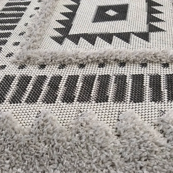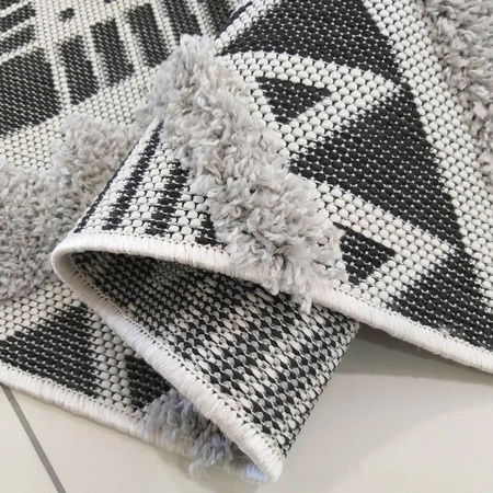 Modny dywan sznurkowy w azteckie, geometryczne wzory, romby i kwadraty w odcieniach szarości sprawdzi się w każdym stylowym salonie, ale i na tarasie. Uniwersalna wysokość runa, wynosząca 22 mm sprawi, że będzie przyjemny w dotyku dla stóp, jednocześnie zapewniając łatwość w utrzymaniu czystości.