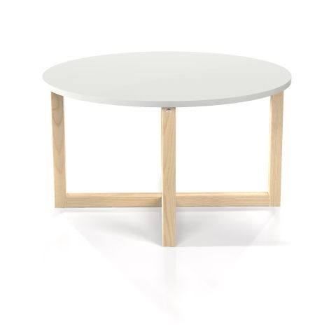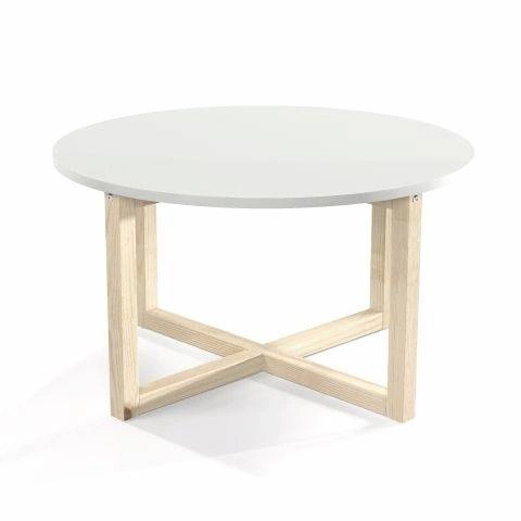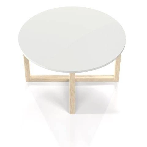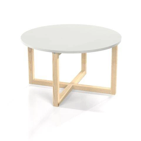 - Minimalistyczny stolik kawowy z oryginalnym, drewnianym stelażem. Okrągły, biały blat i drewniane nogi. Wyjątkowo stabilny i stylowy. Do nowoczesnego salonu, pokoju dziennego, także lokalu gastronomicznego.