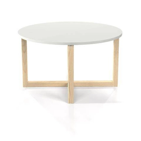 Okrągły stolik kawowy CROSSDES ma stelaż wykonany z litego drewna sosnowego lakierowanego bezbarwnie. Blat stolika wykonano z wysokiej jakości płyty laminowanej. Blat został dodatkowo zabezpieczony i wzmocniony obrzeżem PCV.