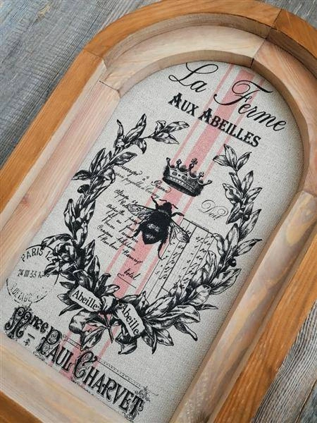 Rustykalna dekoracja ścienna z motywem pszczoły. W środku drewnianej ramy w kształcie łuku umieściliśmy obraz w stylu vintage drukowany na tkaninie lnianej. Rozmiar dekoracji 37 x 56 cm. Dekoracja posiada zamontowany metalowy wieszak.