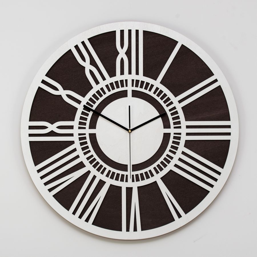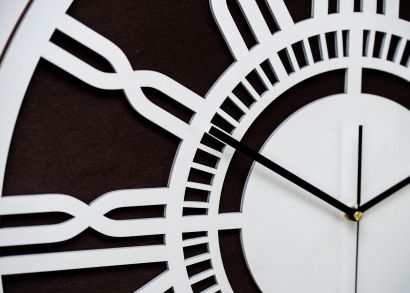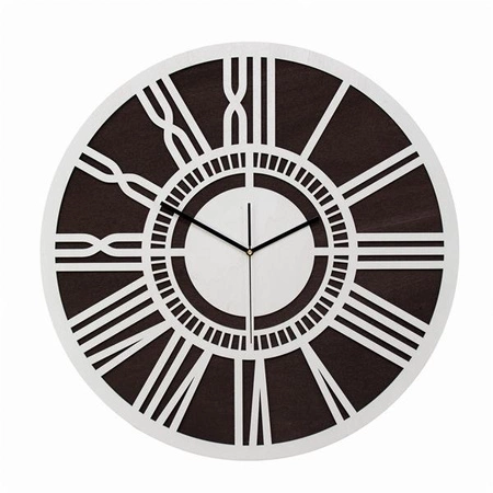 Nowoczesny zegar ścienny LOFTOWY wykonany z dwóch warstw sklejki, kolor biały, bejca wenge, ORNAMENTI