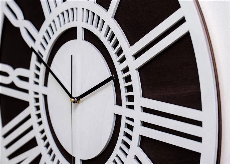 Cechą charakterystyczną zegara LOFTOWEGO jest perfekcyjne wykonanie z solidnych, odpornych na uszkodzenia i co najważniejsze naturalnych materiałów. Sam zegar składa się z dwóch warstw sklejki — ażurowej tarczy w kolorze białym z pięknie wyeksponowanymi rzymskimi cyframi, oraz podkładu w kolorze bejcy wenge. Takie połączenie kolorystyczne z pewnością sprawdzi się w każdym nowoczesnym, nieco surowym stylu loftowym i industrialnym.