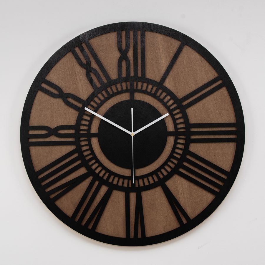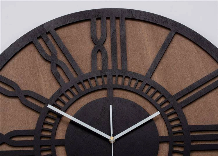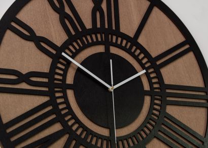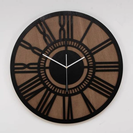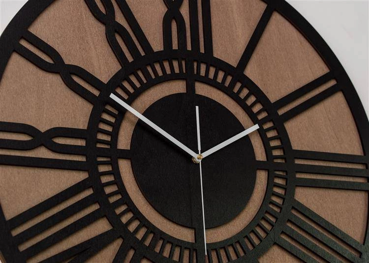 Zegar LOFTOWY w kolorze czarny, bejca orzech został wykonany z dwóch warstw sklejki brzozowej, które zostały kolejno na siebie nałożone. Warstwa zewnętrzna to pięknie wykonana ażurowa tarcza z mocno wyeksponowanymi cyframi rzymskimi, druga zaś to podkład zegara wykończony piękną bejcą w kolorze orzecha. Takie połączenie kolorystyczne doskonale sprawdzi się w każdym nowoczesnym, ale także klasycznym wnętrzu. Do wyboru są również inne warianty kolorystyczne zegara — sprawdź, który z nich spełni Twoje oczekiwania.
