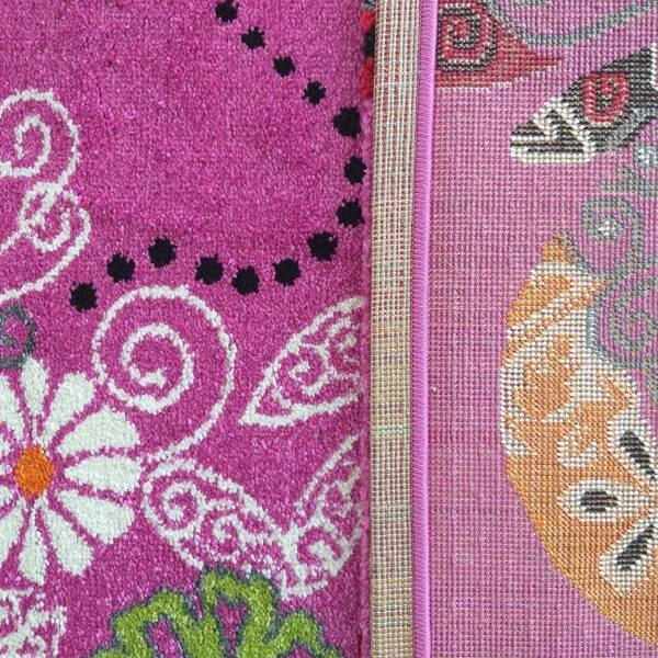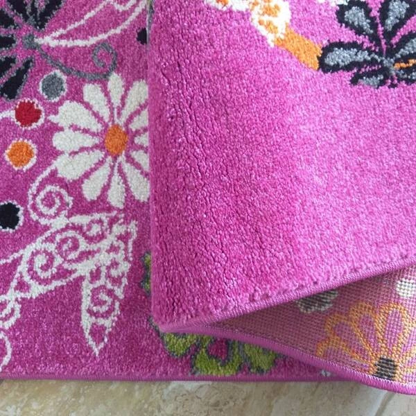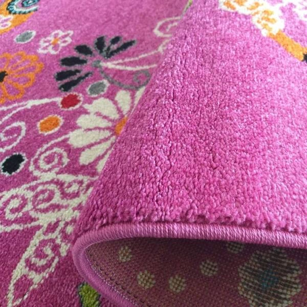 - Dywan dziecięcy Bella 114 z kolorowymi motylami i kwiatami na różowym tle to idealna ozdoba pokoju dziewczynki. Bezpieczny, miękki i odporny – idealny do zabawy, nauki i odpoczynku.