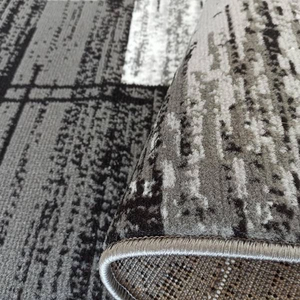 - Nowoczesny dywan Soho 13 w odcieniach szarości i czerni, z abstrakcyjnym wzorem prostokątów i przetarć. Idealny do salonu, biura i pokoju młodzieżowego. Wykonany z przędzy BCF, spód z juty dywanowej.