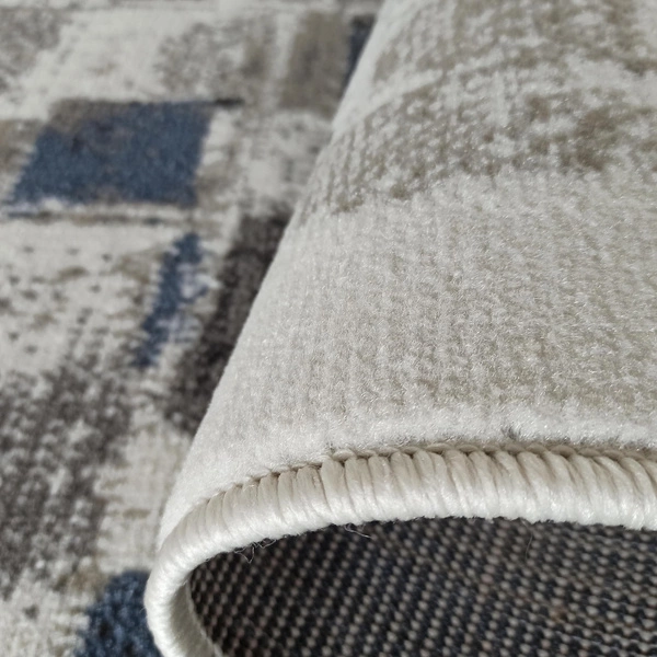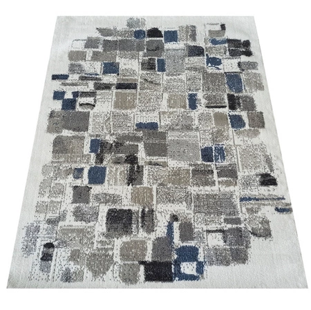 Dywan Lara 04 to propozycja dla miłośników nowoczesnego wzornictwa i jasnych wnętrz. Tło w kolorze złamanej bieli przełamane zostało nieregularnymi blokami w odcieniach szarości, beżu, granatu i czerni, które układają się w dynamiczną, niepowtarzalną mozaikę. Wzór przypomina kolaż fragmentów tekstur lub stylowy patchwork – doskonale ożywia wnętrze, dodając mu nowoczesnego charakteru bez przesadnej dominacji. To dywan, który sprawdzi się jako subtelny, ale wyrazisty akcent dekoracyjny.