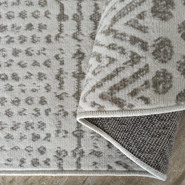 - Nowoczesny dywan Lara 06 z etnicznym wzorem w biało-szarej kolorystyce. Wykonany z przędzy BCF, z runem o wysokości 9 mm. Lekki, praktyczny i dekoracyjny – idealny do salonu, pokoju młodzieżowego i wnętrz boho.