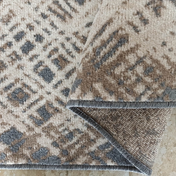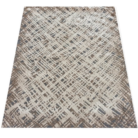 Dywan Roxanne 07 przyciąga wzrok nowoczesnym, dynamicznym wzorem opartym na przecinających się liniach w odcieniach beżu, brązu i szarości. Układ graficzny nawiązuje do stylu geometrycznego, ale jednocześnie pozostaje stonowany i harmonijny. Kompozycja barw tworzy efekt przestrzenności, który świetnie prezentuje się na tle jasnych oraz drewnianych podłóg. Dywan sprawdzi się zarówno w nowoczesnych wnętrzach, jak i aranżacjach inspirowanych stylem loftowym.
