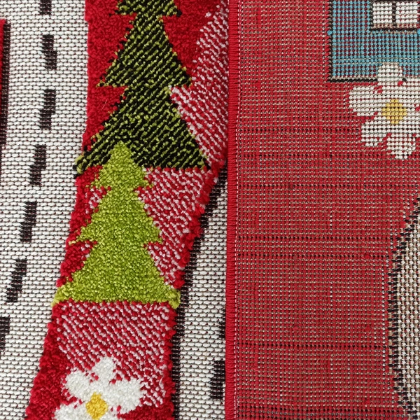 Kolorowy dywan z drogą, domkami i czerwonym tłem