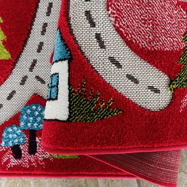 Color Kids 02 czerwony to wyrazisty dywan dziecięcy, który od razu przykuwa uwagę intensywną czerwienią i krętą drogą wijącą się przez zabudowania i drzewa. Motyw wioski z domkami, kwiatkami i jeziorkami zachęca do zabawy oraz pobudza wyobraźnię dziecka. To idealna trasa do zabawy samochodzikami, a jednocześnie funkcjonalna dekoracja pokoju dziecięcego.Wycinany, sensoryczny i bezpieczny