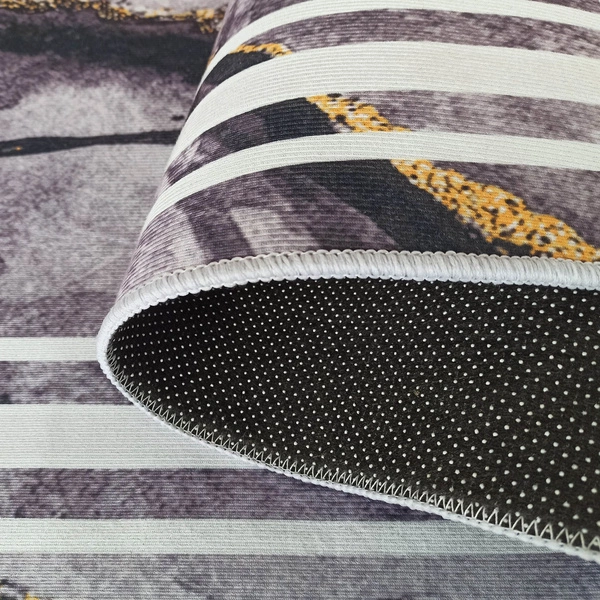 Dywan Horeca-New 118 przyciąga wzrok eleganckim wzorem inspirowanym strukturą marmuru. Ciemnoszare tło wzbogacone jest o delikatne akcenty rdzawobrązowe i kontrastujące, białe linie tworzące geometryczną ramę. Ten nowoczesny dywan idealnie wkomponuje się w modne, minimalistyczne przestrzenie, nadając im stylowego wyrazu. Wyraźna forma wzoru sprawia, że dywan doskonale prezentuje się zarówno na jasnym, jak i ciemnym tle.Praktyczny dywan do prania z antypoślizgowym spodem