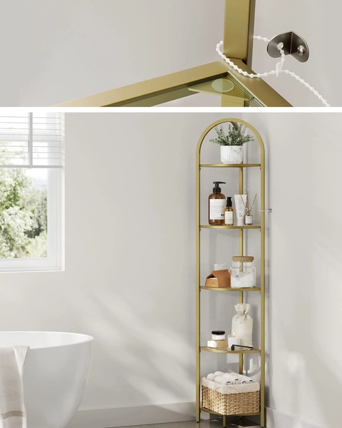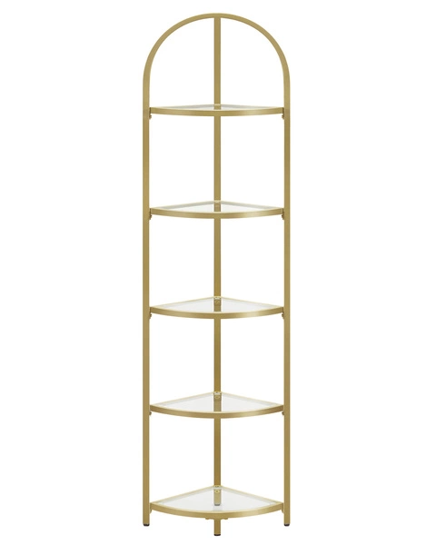 Regał wykonany ze szkła i stali malowanej proszkowo na kolor złoty. Produkt tworzy niesamowitą dekorację Twojego pomieszczenia, dzięki łukowemu designowi. Półki regału są stabilne, a więc możemy umieścić na nich książki, kwiaty w wazonach, ozdobne figurki, dziecięce zabawki oraz ramki ze zdjęciami. Nowoczesny, luksusowy a zarazem ciekawy wygląd regału, te cechy na pewno skłonią Cię do wyboru tego mebla. Regał cechuje się uniwersalnością oraz funkcjonalnością, będzie świetnie pasował do salonu, sypialni, łazienki, domowego gabinetu, kuchni, a 5 półek ułatwi nam dostęp do ulubionych rzeczy. Regał na pewno wpasuje się w wystrój niejednego pomieszczenia. Matowa rama z mieniącymi się drobinkami daje niesamowity efekt. Stalowa konstrukcja zapewnia stabilność mebla. Idealnie spasowane elementy ramy oraz szklane półki nadadzą Twojemu wnętrzu wdzięku. Zadbaj o estetykę swojego salonu, pokoju, kuchni czy sypialni wybierając produkty sprawdzone, o najwyższej jakości wykonania.