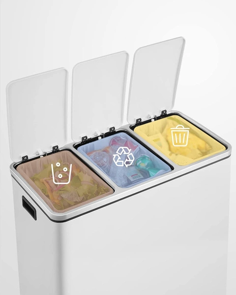 Kosz na odpady z 3 osobnymi, wyjmowanymi pojemnikami sprawdzi się w każdej kuchni, nawet tej najmniejszej. Warto wspomnieć jak ważna jest segregacja śmieci w obecnych czasach. Dzięki segregacji śmieci mamy znaczący wpływ na otaczające nas środowisko. Dokonując prawidłowego podziału ograniczamy tony śmieci, które są zagrożeniem dla życia ludzi i zwierząt. Kosz możemy umieścić również w pokoju czy też garażu, wszędzie tam, gdzie gromadzą nam się śmieci. Użyta w koszu powierzchnia, która nie pozostawia brzydkich śladów palców sprawi, że ten produkt spełni Twoje największe oczekiwania. Czyż nie chodzi nam o łatwe i szybkie czyszczenie? Oczywiście, że tak i właśnie z tym koszem to osiągniesz. Szczelne pokrywy uniemożliwiają roznoszenie się nieprzyjemnych zapachów z kosza.