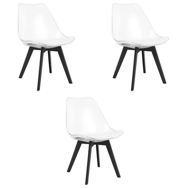• krzesła TRANSPARENTNE z białą poduszką i nogami z tworzywa sztucznego w kolorze CZARNYM