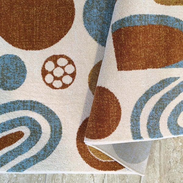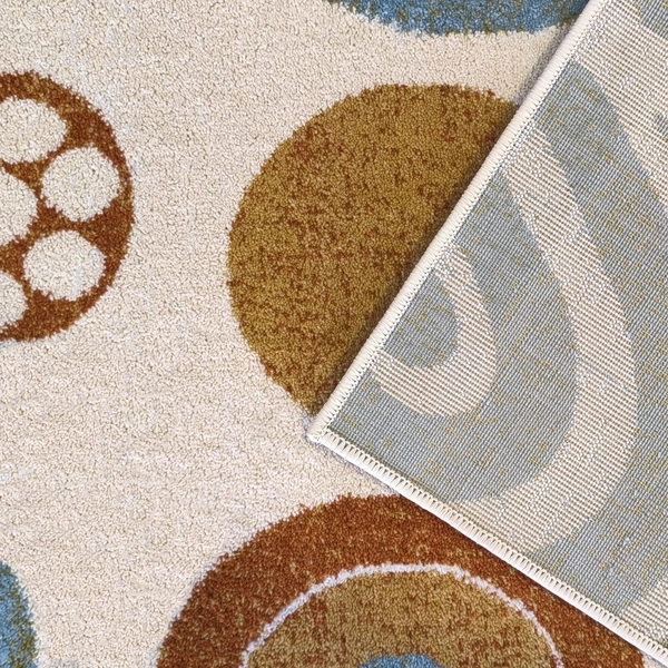 Dywan dziecięcy Lovi Lumi 02 to harmonijne połączenie estetyki, zabawy i komfortu. Projekt wzbogacony jest o kolorowe okręgi, tęczowe motywy oraz miękkie, nieregularne formy, które tworzą przyjazne, inspirujące otoczenie dla malucha. Ciepłe barwy błękitu, terakoty i beżu na jasnym tle wprowadzają pogodny nastrój do wnętrza i pobudzają dziecięcą wyobraźnię.Miękki dywan do zabawy i odpoczynku