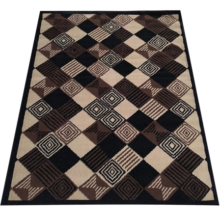 Dywan Alfa 17 brązowy to propozycja dla miłośników klasycznych kolorów w nowoczesnym wydaniu. Wzór zbudowany z rombów i kwadratów w odcieniach brązu, czerni i beżu tworzy spójną, geometryczną całość. Taki dywan znakomicie odnajdzie się w salonie, sypialni czy przedpokoju, dodając wnętrzu głębi i przytulności.