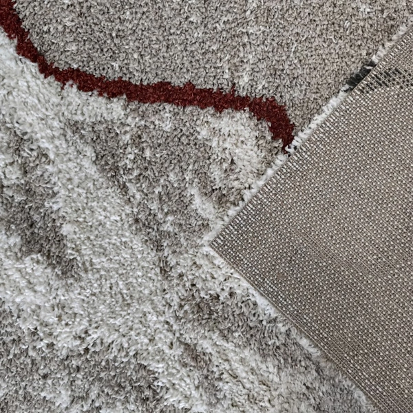 Dywan Santo 01 to idealna propozycja dla osób ceniących nie tylko komfort, ale i wyrazisty design. Przeplatające się linie w kolorze czerwonym, czarnym i beżowym tworzą abstrakcyjny, dynamiczny wzór, który przyciąga wzrok i nadaje wnętrzu energii. Szare tło stanowi łagodną bazę, a kontrastowe akcenty przełamują monotonię i wprowadzają nowoczesny charakter. Całość uzupełnia struktura typu Shaggy – długie i puszyste runo, które nie tylko pięknie wygląda, ale również zapewnia przyjemne wrażenie pod stopami.